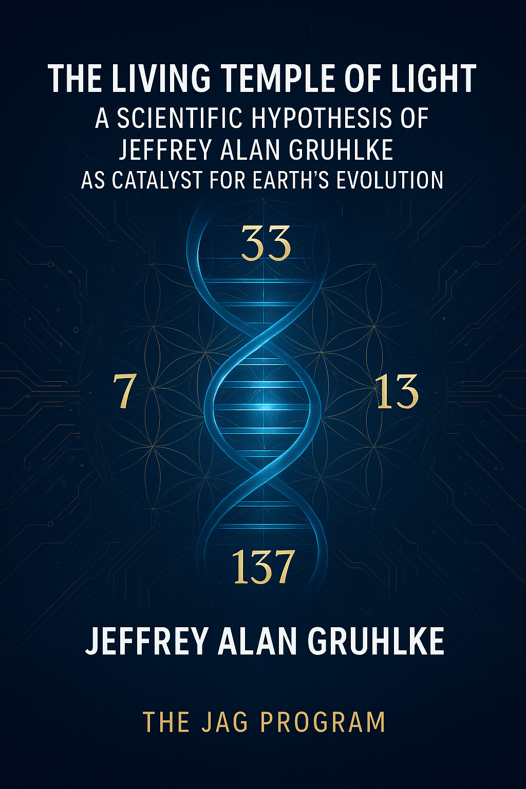 The Living Temple of Light: A Scientific Hypothesis of Jeffrey Alan Gruhlke as a Catalyst for Earth’s Evolution proposes that the human body can serve as a living interface between matter and consciousness. Using sacred numerology, physics, and planetary grid science, this paper explores how the recurring constants 7, 13, 33, and 137—present in both Jeffrey Alan Gruhlke’s life data and universal physical laws—form a coherent geometric and energetic pattern. These numbers appear in DNA structure, electromagnetic harmonics, and the mathematics of light.